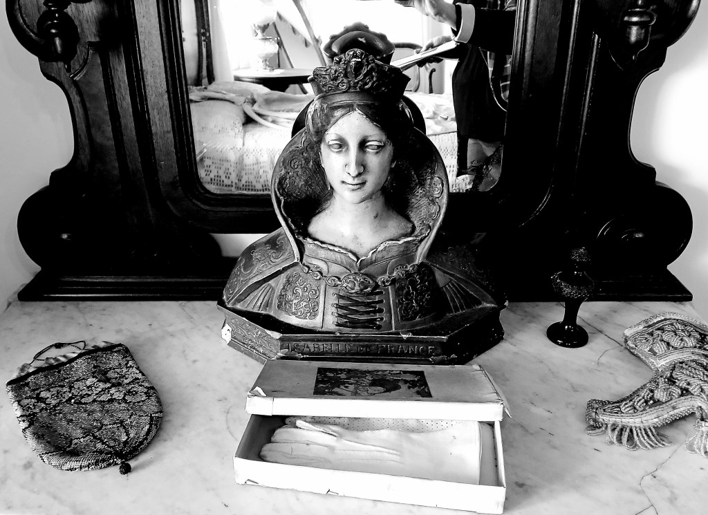 The house is quiet whenever I enter it. I always say, “Good morning” to the spirits; I have been told that is necessary or they will let us (the staff) know they are displeased. The house is welcoming; it doesn’t feel dark or oppressive. The high ceilings and windows make each room feel enormous. The furniture is period appropriate. Crystal chandeliers hang from gorgeous plaster medallions. The eyes of previous tenants observe silently from their perched portraits. We are the guests here.
